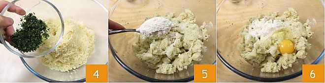 et ajoutez-les aux pommes de terre 4, ajoutez la farine 5, l'œuf 6 et ajustez le sel. Pétrissez avec les mains (pas trop longtemps) jusqu'à obtenir un mélange homogène et assez compact.