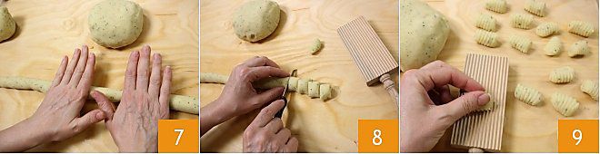 Avec la pâte obtenue, formez des "bâtonnets" d'environ 2,5 cm de diamètre 7 et coupez-les en morceaux d'environ 2 cm 8. Passez chaque morceau sur la planche en bois rainurée 9 (ou sur les dents d'une fourchette) pour former les stries caractéristiques des gnocchis et la cavité en dessous, qui servira à mieux retenir la sauce. Placez les gnocchis obtenus dans un endroit frais, disposés sur un chiffon propre et légèrement fariné.