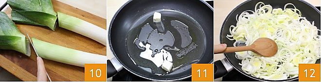 Préparez maintenant la crème de poireaux : nettoyez, lavez et coupez finement les poireaux 10 (seulement la partie blanche et tendre), puis mettez-les à cuire doucement dans une casserole avec de l'huile et du beurre pendant 15-20 minutes à feu très doux (11-12),