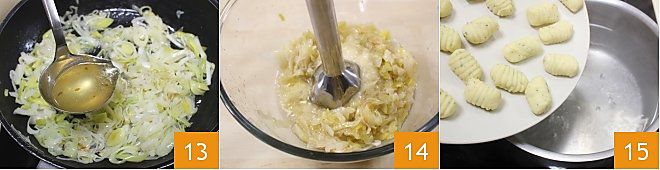 puis ajoutez le bouillon de légumes 13 et poursuivez la cuisson jusqu'à ce qu'ils deviennent très tendres. Ajoutez le poivre blanc et ajustez éventuellement le sel, puis mixez le tout pour obtenir une crème 14. Faites cuire les gnocchis dans une grande quantité d'eau salée (une portion à la fois) pendant quelques minutes 15