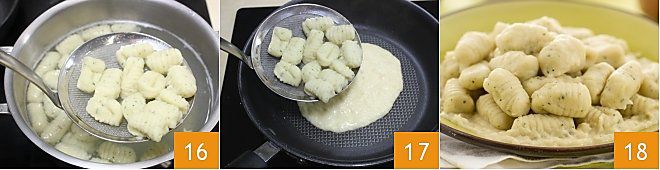 puis, quand ils remontent à la surface, égouttez-les 16 et ajoutez-les à la crème que vous aurez placée dans une poêle 17. Faites-les sauter quelques secondes à feu moyen pour les mélanger à la crème, puis servez-les encore chauds 18.