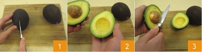 Pour préparer l'hummus d'avocat, commencez par l'avocat : avec un couteau, coupez-le verticalement 1, puis divisez-le en deux 2 et enfin retirez le noyau à l'aide d'un couteau, en l'incisant pour l'extraire plus facilement 3.