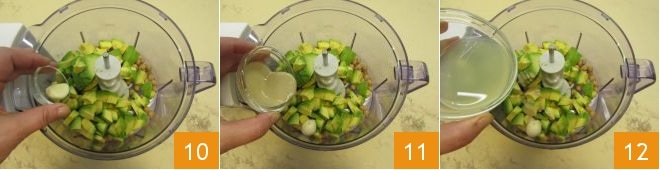 Ajoutez l'ail pelé 10, la tahina 11 et le jus de citron filtré 12. Salez et poivrez.