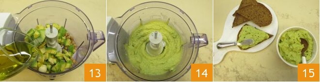 Enfin, versez l'huile 13 et mettez le mixeur en marche à vitesse moyenne jusqu'à obtenir une crème lisse et sans grumeaux 14. Transférez l'hummus d'avocat dans un bol de service, en ajoutant une pincée de graines de sésame blanches et noires 15. Votre hummus d'avocat est prêt à être dégusté !