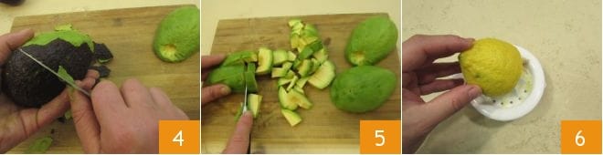 Pelez l'avocat 4 et enfin coupez-le en dés 5 : vous devez obtenir environ 450 grammes de pulpe d'avocat. Pressez un citron avec un presse-agrumes 6