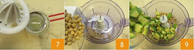 et filtrez-en le jus à l'aide d'une passoire, en le recueillant dans un petit bol 7. À ce stade, prenez le mixeur et ajoutez-y les pois chiches précuits égouttés 8 et l'avocat en dés 9.