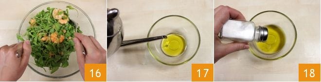 Mélangez la salade 16. Occupez-vous finalement de l'assaisonnement : préparez une émulsion avec de l'huile 17, du sel 18, du poivre.