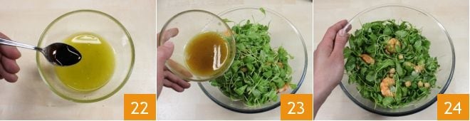 terminez avec une cuillère à café de vinaigre balsamique 22. Assaisonnez la salade avec l'assaisonnement préparé 23. Votre salade de pois chiches, crevettes et roquette est maintenant prête à être servie 24 !