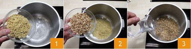 Pour réaliser la salade d'épeautre et d'orge estivale, commencez par cuire les céréales : placez dans une grande casserole l'orge 1 et l'épeautre perlés 2, ajoutez suffisamment d'eau salée pour couvrir les céréales 3 et faites-les cuire en suivant les indications sur l'emballage (en général, ils ont besoin d'environ 15-18 minutes de cuisson);