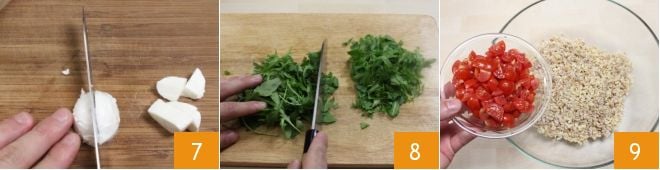 éliminez l'eau de conservation des boules de mozzarella et coupez-les en dés 7. Nettoyez la roquette et rincez-la bien sous l'eau; hachez grossièrement également les feuilles de roquette 8. À ce stade, prenez le bol avec les céréales et ajoutez les tomates cerises 9,