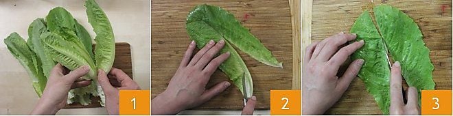 Pour préparer les rouleaux froids de laitue à la viande, commencez par effeuiller la laitue 1 : retirez les feuilles les plus externes qui sont un peu dures ou abîmées et éliminez la base du plant. Lavez et séchez bien les feuilles de laitue sous l'eau courante et avec un petit couteau, éliminez la nervure centrale de la feuille 2, puis divisez-la en deux 3.