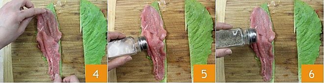 À ce stade, étalez 2 tranches de carpaccio sur chaque moitié de feuille 4 et assaisonnez avec du sel 5 et du poivre 6 à votre goût.