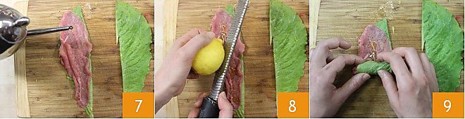 Versez un filet d'huile sur les tranches assaisonnées 7 et râpez un peu de zeste de citron 8. Si vous le souhaitez, vous pouvez étaler un peu de moutarde sur la tranche de carpaccio. Ensuite, enroulez la feuille de laitue farcie en plaçant le côté de la fermeture vers le bas 9, afin que les rouleaux ne se déroulent pas et ne se désintègrent pas. Vos rouleaux froids de laitue à la viande sont prêts à être dégustés ! N'oubliez pas de conserver le tout au réfrigérateur jusqu'au moment de servir.