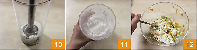 Plongez le mixeur plongeant dans le verre 10 et mixez les ingrédients à vitesse moyenne, jusqu'à ce que le mélange ait épaissi 11, cela prendra quelques secondes. Versez ensuite la fausse mayonnaise dans le bol avec les légumes et l'œuf coupés en cubes et mélangez le tout 12, si nécessaire, rectifiez l'assaisonnement en sel et en poivre.