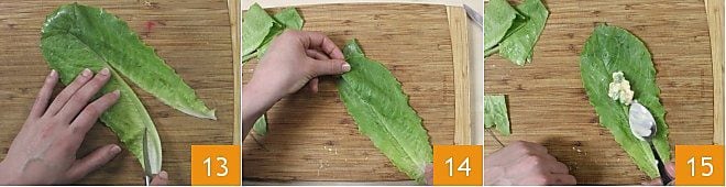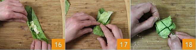 À ce stade, lavez et séchez bien les feuilles de laitue, éliminez la côte centrale croquante avec un petit couteau et divisez-les en deux 13. Après avoir superposé les deux moitiés de la feuille 14, versez une cuillère de mélange au centre 15.