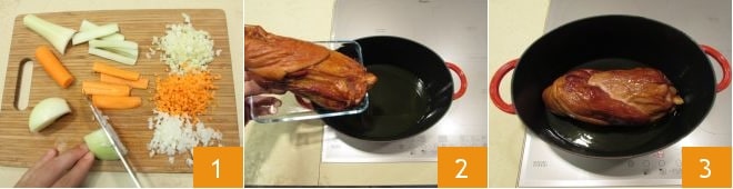 Pour préparer le jarret fumé avec pommes de terre et choucroute, commencez par réaliser la brunoise pour le soffritto : épluchez la carotte et l'oignon, puis retirez les filaments externes du céleri. Hachez le tout finement 1 et réservez. À ce stade, versez l'huile dans une cocotte, de préférence en fonte, et ajoutez le jarret fumé 2. À feu vif, saisissez-le de tous les côtés 3