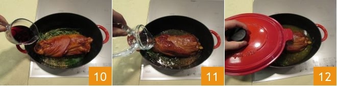 Attendez quelques minutes en retournant souvent le jarret et déglacez avec le vin rouge 10. Seulement lorsque celui-ci sera complètement évaporé, ajoutez de l'eau 11, en tenant compte que le niveau de cette dernière doit arriver à couvrir environ la moitié de la hauteur du jarret. À ce stade, couvrez avec un couvercle 12 et laissez cuire environ 1 heure ou en tout cas jusqu'à ce que la viande soit tendre, seulement alors vous pourrez ajuster le sel.
