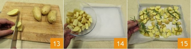 Entre-temps, occupez-vous également de préparer les pommes de terre : lavez-les sous l'eau courante et sans les peler, coupez-les en cubes d'environ 2-3 cm 13. Transférez les pommes de terre dans un plat chemisé de papier sulfurisé 14 et assaisonnez-les avec du sel, du poivre et de l'huile. Ajoutez également le romarin frais 15 et faites cuire le tout dans un four statique préchauffé à 200° pendant environ 40 minutes, en retournant de temps en temps les pommes de terre.