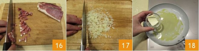 Pendant que les pommes de terre cuisent, préparez également la choucroute, donc pour les parfumer, coupez le speck en morceaux 16 et hachez finement l'oignon 17. Versez l'huile dans une casserole, ajoutez le beurre 18 et laissez-le fondre à feu modéré.