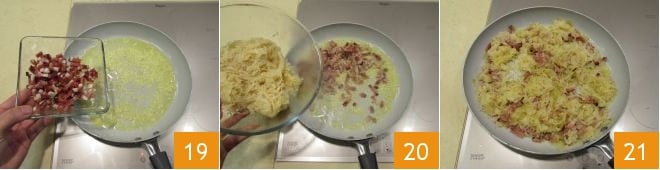À ce stade, ajoutez l'oignon, laissez-le flétrir et ajoutez également le speck 19. Pendant ce temps, égouttez la choucroute du liquide de cuisson, ajoutez-la dans la poêle 20 et ajoutez une pincée de sel. Faites-les cuire à feu vif pendant 15-20 minutes, jusqu'à ce qu'elles soient tendres 21, en ajoutant une louche d'eau chaude si nécessaire.