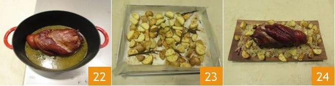 À ce stade, le jarret 22 et les pommes de terre 23 seront également prêts. Servez-les ensemble 24 et dégustez votre jarret fumé avec pommes de terre et choucroute encore chaud !
