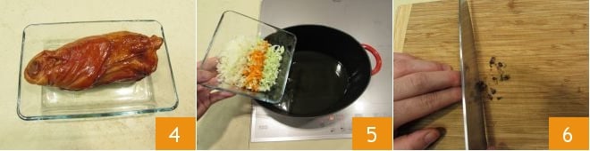 et seulement lorsqu'il sera bien doré, retirez-le de la cocotte et gardez-le au chaud 4. Versez la brunoise préparée précédemment dans l'huile de cuisson du jarret 5 et laissez-la revenir à feu modéré. Pendant ce temps, hachez les baies de genévrier avec un couteau 6 (alternativement, vous pouvez utiliser un mortier pour les écraser)