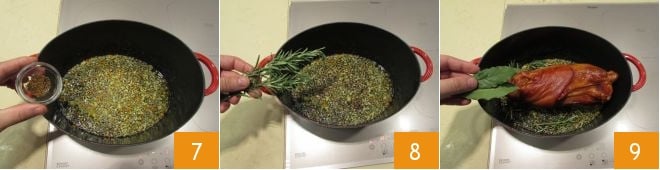 et ajoutez-les au reste du soffritto 7. Ajoutez également la branche de romarin 8, le jarret et les feuilles de laurier 9.