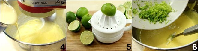 Entre-temps, préparez la crème pour le remplissage en versant les jaunes dans un bol (ou dans le bol d'un mixeur) et en fouettant pendant 5 minutes jusqu'à ce qu'ils deviennent gonflés, clairs et mousseux ; à ce stade, ajoutez le lait concentré 4 et fouettez pendant encore 5-10 minutes, puis ajoutez le jus de lime 5 et fouettez pendant encore 5 minutes. Enfin, ajoutez le zeste de lime râpé 6 et amalgamez-le aux ingrédients.