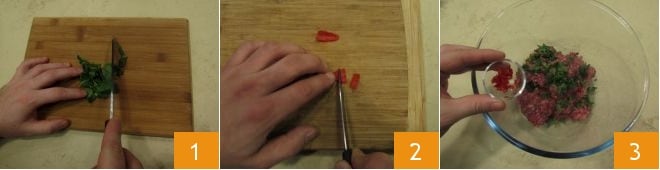 Pour préparer la kofta (boulettes moyen-orientales), hachez finement les feuilles de menthe 1, puis coupez le piment en deux dans le sens de la longueur, retirez les graines avec la pointe d'un couteau et émiettez-le 2. Placez la viande d'agneau dans un bol avec la menthe et le piment hachés 3.