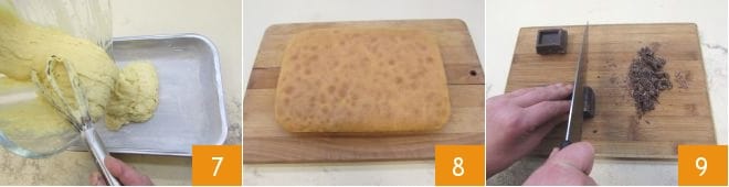 Beurrez et farinez un moule rectangulaire de 30,5x22,5 cm et versez-y la pâte 7. Enfournez dans un four préchauffé à 180° pendant 30 minutes (160° pendant 20 minutes s'il s'agit d'un four ventilé). Une fois prêt, vous pourrez sortir la base du four et la laisser tiédir dans le moule une dizaine de minutes puis la démouler pour la laisser refroidir complètement : cela prendra environ un couple d'heures 8. Pendant ce temps, chauffez la crème dans une casserole. Ensuite, hachez grossièrement le chocolat noir 9