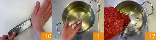 Préparez maintenant la sauce. Écrasez l'ail en chemise 10 et mettez-le dans une casserole avec un filet d'huile 11 et faites revenir pendant quelques minutes. Ajoutez les tomates pelées 12, préalablement écrasées avec les mains ou avec une fourchette.