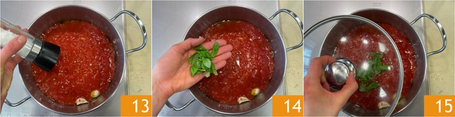 Assaisonnez de sel et de poivre 13, ajoutez le basilic 14, couvrez avec un couvercle 15 et faites cuire pendant 15-20 minutes, ou jusqu'à ce que la sauce soit épaisse.