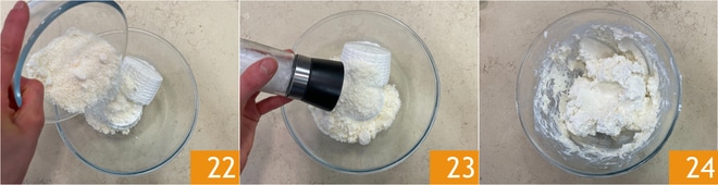 Dans un bol, mettez la ricotta, ajoutez le parmesan râpé 22, assaisonnez de sel et de poivre 23. Mélangez jusqu'à obtenir une crème homogène 24.