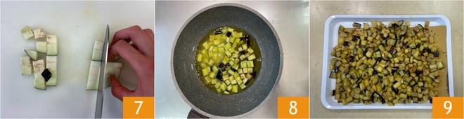 Enfin, en dés 7. Faites-les frire dans de l'huile chaude en abondance 8, jusqu'à ce qu'ils deviennent dorés et croustillants. Transférez-les ensuite sur du papier absorbant 9 pour éliminer l'excès d'huile.