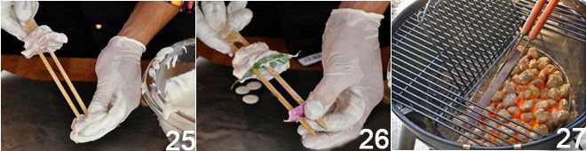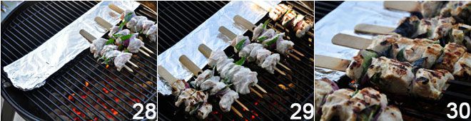 CUISSON DU SHISH TAOUK Une fois la préparation des sauces terminée, on peut procéder à la préparation des brochettes. Il est préférable d'utiliser des brochettes en acier de bonne qualité, des brochettes en bois ou des brochettes en bambou taillées en fourche. Ces dernières sont recommandées car celles à une seule tige, en présence de liquides gras, tendent à faire tourner la viande sur elle-même lorsqu'on essaie de les retourner pour les cuire de l'autre côté. Si l'on ne trouve pas les brochettes en bambou, on peut en alternative utiliser deux brochettes parallèles qui permettront de retourner le kebab plus facilement. Dans tous les cas, si l'on utilise des broches en bois, il est préférable de les tremper pendant un certain temps pour éviter qu'elles ne prennent feu pendant la cuisson. On commence par retirer l'excès de marinade et on alterne sur la broche les cubes de viande, des lamelles d'oignon et une feuille de laurier (25-26). De cette façon, chaque morceau de viande aura un côté en contact avec l'oignon et l'autre avec le laurier. La chaleur libérera les huiles essentielles qui aromatiseront le cube. Une fois toutes les brochettes complètes, on passe au grill 27.