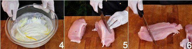 Fait cela, on coupe le filet de dinde 5, en essayant d'obtenir des cubes de même taille (6-7) pour permettre une cuisson uniforme.