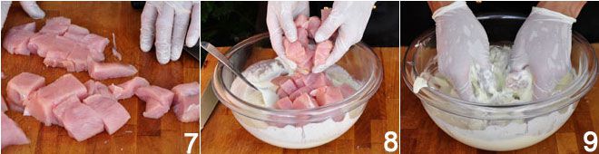 On met les cubes dans la marinade 8, on les masse pendant quelques secondes 9, on couvre avec du film plastique et on place au réfrigérateur pendant au moins 1 heure.
