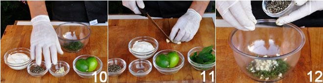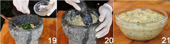 l'ail émincé, la menthe (seulement à la fin si l'on utilise le mixeur), le sel et le poivre 19. On pile 20 ou on mixe le tout pour amalgamer les ingrédients. On peut choisir d'obtenir une texture grossière ou une émulsion lisse. Dans ce cas, nous avons préféré une texture grossière pour apporter rusticité au plat 21.