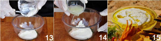 au jus de citron vert 14, puis on mélange énergiquement. On place le labneh dans un petit bol et on recouvre la surface d'une fine couche d'huile d'olive extra vierge 15, qui donnera de la saveur et retardera l'oxydation. Placez le labneh au réfrigérateur et laissez-le reposer.