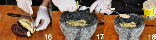 LE BABA GANOUSH (MUTABBEL) Pour préparer le baba ganoush (ou muttabel) on rôtit l'aubergine sur le feu jusqu'à ce que l'extérieur soit complètement brûlé et que l'intérieur soit tendre et moelleux. On l'ouvre en deux et on recueille la pulpe avec une cuillère 16, veillant à ne pas gratter trop les parties brûlées. On place la pulpe dans un mortier, si l'on désire la piler à la main ou dans un verre pour ensuite utiliser un mixeur plongeant. On ajoute le jus de citron vert 17, une généreuse dose de tahini 18 avec un filet d'huile d'olive extra vierge,
