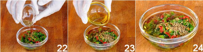 LE MUHAMMARA On hache les piments doux et piquants en veillant à ne pas les réduire en purée, car les graines et la peau donneront encore une note rustique. Ajoutez du cumin 22, juste un peu de sel, du jus de citron vert, l'huile 23 et amalgamer énergiquement 24.