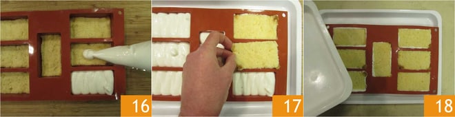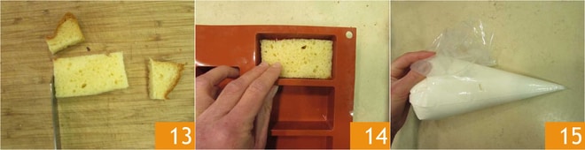 et découpez 14 rectangles de 5x9 cm 13. Disposez 7 rectangles de pandoro dans un moule en silicone de 7 portions 14 et appuyez légèrement avec les doigts. Transférez la crème de yaourt dans une poche à douille sans embout 15.