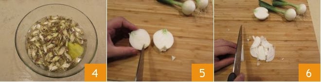 Transférez-les ensuite dans un bol avec de l'eau très froide et du citron 4. Pendant ce temps, occupez-vous du cébette. Éliminez la partie verte puis la base 5 et enfin émincez finement 6.