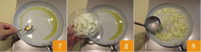 Dans une poêle, versez l'huile et faites chauffer à feu moyen avec l'ail quelques instants, puis éliminez-le 7. Ajoutez le cébette dans le fond et faites-le sauter pendant deux minutes 8. Ensuite, versez une louche d'eau et laissez mijoter pendant 10-12 minutes 9.