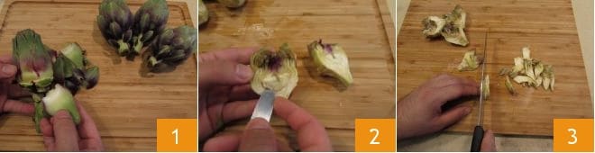 Pour préparer les linguines aux artichauts et sardines, commencez par nettoyer les artichauts. Éliminez les feuilles les plus extérieures 1, qui seraient dures à la cuisson, et coupez les artichauts en deux. Retirez le foin intérieur 2 et coupez les artichauts en lamelles pas trop fines 3.