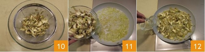 Égouttez les artichauts de l'eau 10 et ajoutez-les dans la casserole 11. Faites cuire le tout pendant environ 10 minutes, en déglacant avec le vin blanc à mi-cuisson 12.