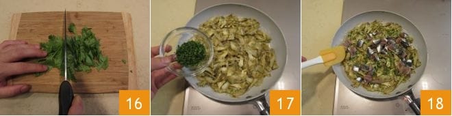 Une fois que vos artichauts sont cuits, hachez finement le persil 16, ajoutez-le dans la poêle 17 et ajoutez également les sardines 18, en continuant à cuire pendant environ 5 minutes.