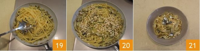 Égouttez les pâtes al dente et ajoutez-les dans la poêle 19. Ajoutez les pignons 20, mélangez le tout et servez 21. Servez les linguines aux artichauts et sardines bien chaudes!