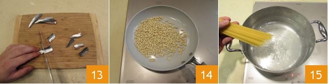 Entre-temps, coupez les filets de sardines en morceaux d'environ 2 cm 13. Si vous n'avez pas de filets mais des sardines entières, il sera nécessaire de les nettoyer: enlevez la tête des sardines fraîches, exercez une légère pression avec les doigts pour les ouvrir en portefeuille et retirez l'arête centrale, en la tirant délicatement avec les doigts. Coupez également la queue avec des ciseaux et rincez bien les filets obtenus sous l'eau courante. Une fois les sardines coupées, versez les pignons dans une poêle et faites-les griller pendant 4-5 minutes 14, en les mélangeant de temps en temps. À ce moment-là, plongez les linguines dans une grande quantité d'eau bouillante, salée à votre goût 15.
