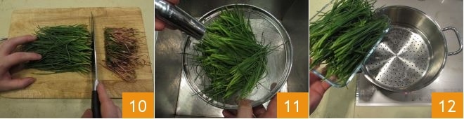 Poursuivez en nettoyant la barbe de frate : éliminez l'extrémité finale rougeâtre 10, puis lavez-la soigneusement sous l'eau courante abondante 11. Faites cuire la barbe de frate à la vapeur pendant environ 3 minutes 12,